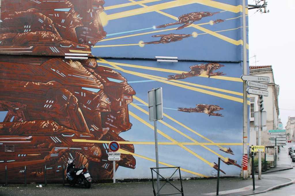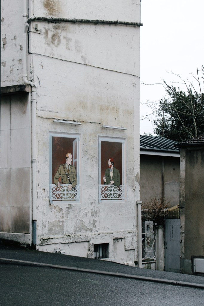 We got to Angoulême from two opposite ends of the world around midnight, stepping off the train into a cold breeze that was almost refreshing after the long journey. As we made our way up the hills, dragging our luggage behind us with the wheels stammering on the stone, we kept stopping to stare at these murals —huge, right there on the buildings, like the whole city had been built inside a comic book.